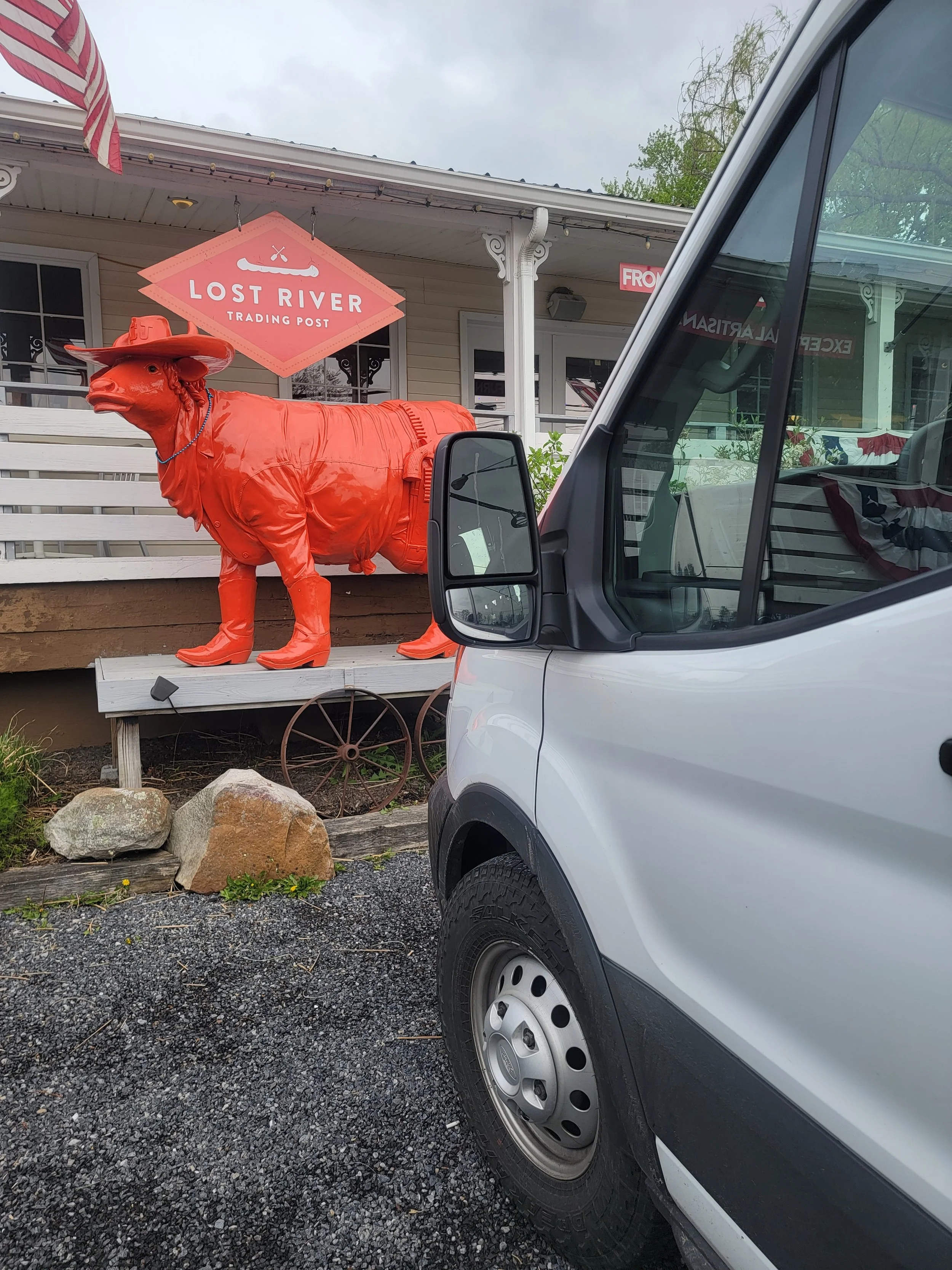 You know you made it to Lost River Trading Post when you see the bright orange cow wearing boots